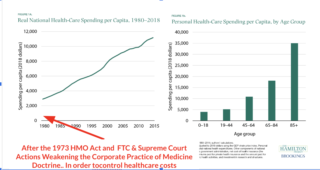 However, CPoM doctrine was weakened in the 1970's by Federal actions intended to control healthcare costs by demoting the profession of medicine from "learned profession" to that of a commodity, and paving the way for corporations to dominate the the medical profession and healthcare system. Today, 74% of physicians are employees of corporations, and healthcare costs have skyrocketed. Existing CPoM laws go broadly un-enforced by state Attorneys Generals despite increasing calls to do so.
